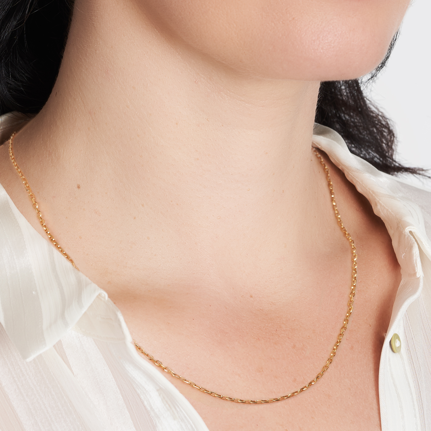 Created in 9K yellow gold, Verri features a triangular 4 sided cable link that has been diamond cut and finished by hand. The prefect chain to wear on its own or with a diamond pendant or cross.