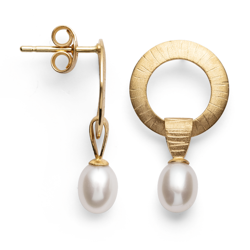These circular ear studs with attached and oval-shaped cultured pearls impress with their sporty, elegant appearance and valuable, solid design. The lines, handcrafted into the 750 yellow gold using special brushes, give this high-quality ear jewelry that certain something. Available with matching necklace chain. Experience the inspiring world of bastian inverun GOLD – only available in selected specialist retailers! Gold and craftsmanship – values for eternity! Bastian Inverun’s new premium gold collection was launched under this motto! From the passion for sophisticated, handcrafted design, a sensual gold collection made of high-quality 750/- yellow gold was created in collaboration with the talented Osnabrück designer Dietmar Sebastian. Hand-finished surfaces meet the finest natural materials and an organically inspired design language. Designs with strong character combine timeless beauty with design perfection. Dimensions: Diameter: 1.5 cm Length including pearl: 2.5 cm