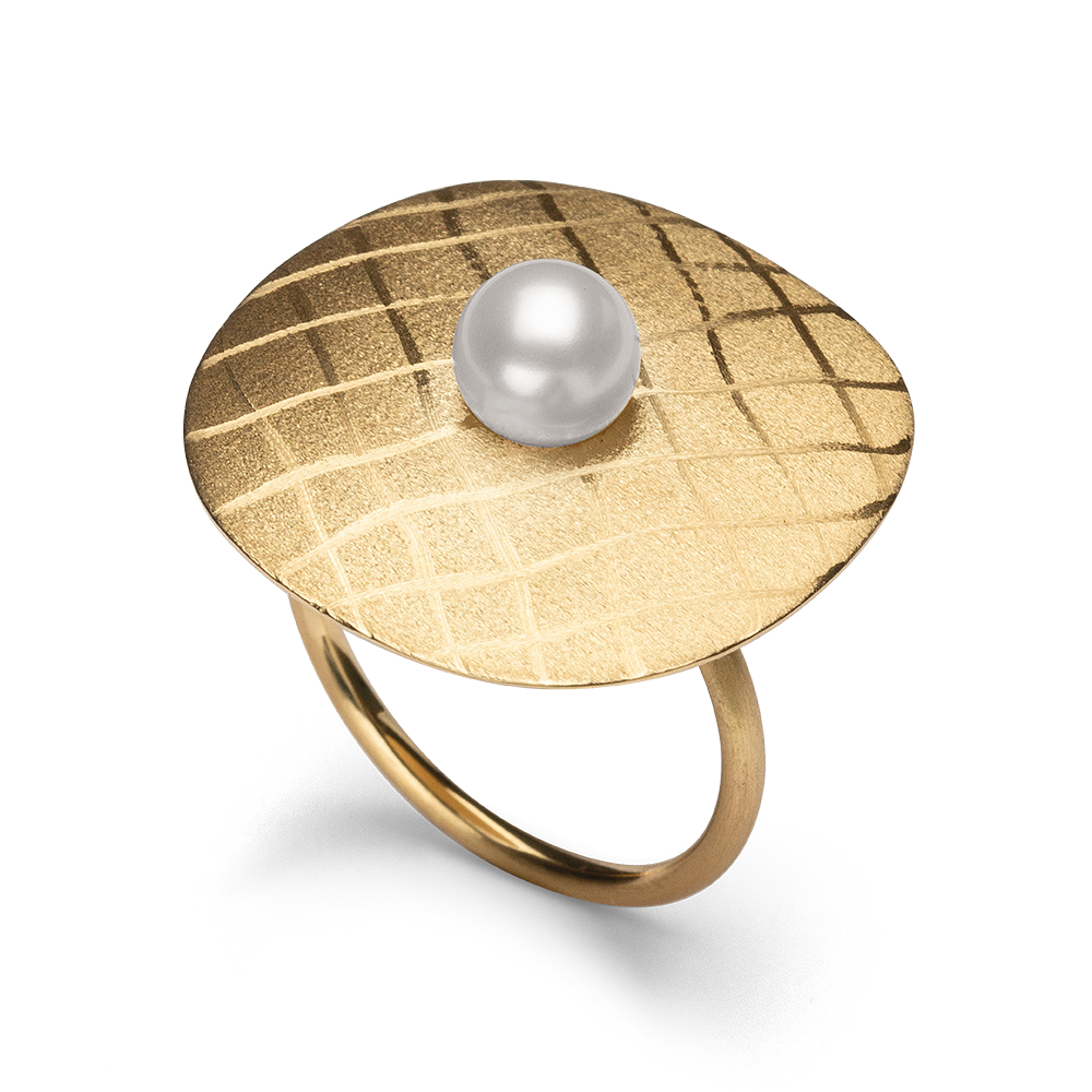 A centrally arranged, iridescent cultured pearl (1.92ct, quality A-AA) meets a strikingly crafted ring head with fine lines on the surface. This piece of jewelry is one of the most distinctive new items in Bastian Inverun’s gold collection. Made from 18-carat gold in a bright, very modern color. Perfect in combination with matching ear studs and matching pendant. Only available from specialist retailers! Gold and craftsmanship – values for eternity! Bastian Inverun’s new premium gold collection was launched under this motto! From the passion for sophisticated, handcrafted design, a sensual gold collection made of high-quality 750/- yellow gold was created in collaboration with the talented Osnabrück designer Dietmar Sebastian. Hand-finished surfaces meet the finest natural materials and an organically inspired design language. Character-strong designs combine timeless beauty with creative perfection. Dimensions: Diameter of ring head: approx. 2.4cm Diameter pearl: approx. 0.6cm Width ring band: approx. 0.15cm