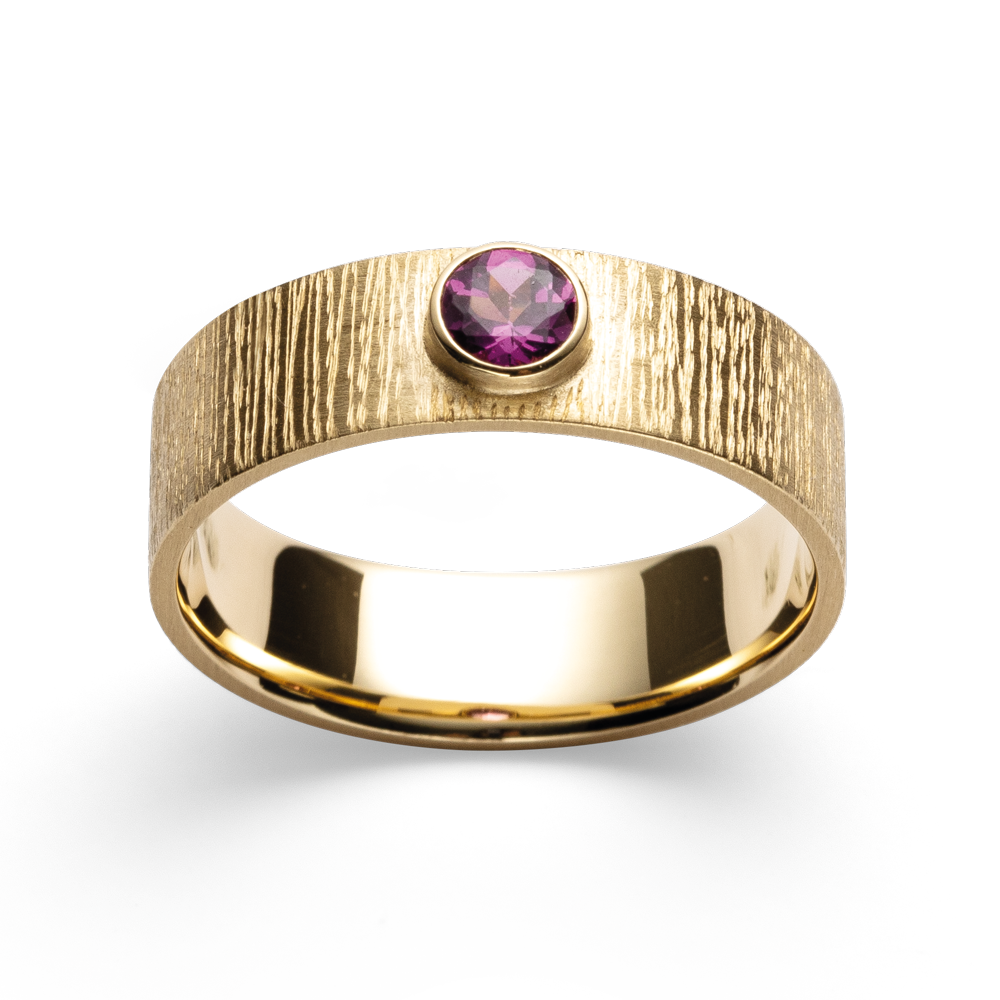 Highly colored, shimmering purple to violet rhodolite from Brazil beautifully presented: This valuable, solid ring made of 18 carat yellow gold with a wide ring band impresses with its strong character surface design in combination with a bright rhodolite gemstone from the garnet class ( Diameter 4mm) in round normal cut and a total of 0.35ct. Magical, hand-crafted designer jewelry that is particularly effective in combination with the matching pendant and matching ear studs. Experience the inspiring world of bastian inverun GOLD – only available in selected specialist retailers! Gold and craftsmanship – values for eternity! Bastian Inverun’s new premium gold collection was launched under this motto! From the passion for sophisticated, handcrafted design, a sensual gold collection made of high-quality 750/- yellow gold was created in collaboration with the talented Osnabrück designer Dietmar Sebastian. Hand-finished surfaces meet the finest natural materials and an organically inspired design language. Designs with strong character combine timeless beauty with design perfection. Dimensions: Width of the ring band: 0.6 cm Diameter gemstone: 0.3 cm