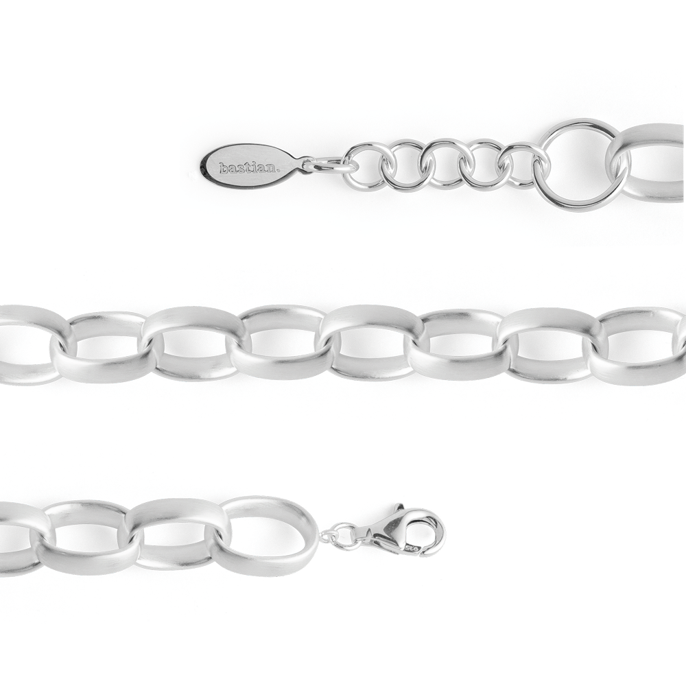 Stylishly interlocking oval jewelry elements made of matt 925/- sterling silver form a bracelet with a strong character. The individual links of the same size make the bracelet an eye-catcher and give it a unique look. Perfect in combination with the matching necklace and earrings. All bastian inverun pieces of jewelry are delivered including matching jewelry packaging. Dimensions: Length: 17 cmExtension chain: 3 cmLength of the links: 1.5 cm Width of the links: 1.1 cm