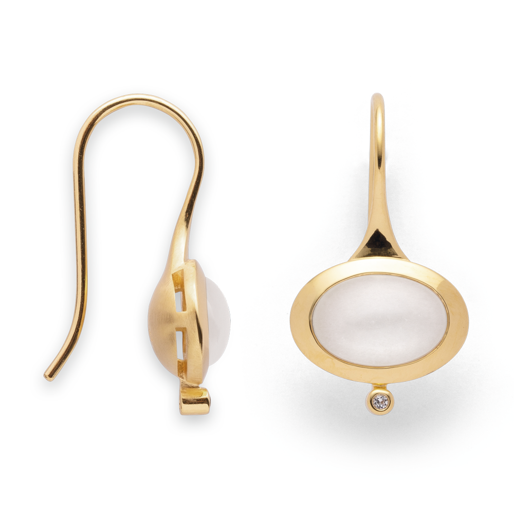 “Magic Moonlight Collection” – timelessly elegant design earrings made of gold-plated 925/- sterling silver impress with their high-quality and craftsmanship. The magical white moonstones (4.18ct in total) in combination with white topazes (total 0.02ct) make the matt and polished earrings special eye-catchers. This pendant was created by the German designer Nadine Resch with great attention to detail and a feeling for the small, special features. Perfect in combination with the corresponding ring and pendant. A sensual, curved shape and a consistently characteristic design signature characterize the jewelry creations of the freelance designer Nadine Resch, who lives in Düsseldorf. Her multifaceted designs always provide fresh inspiration and rebel against the uniformity of today. All bastian inverun pieces of jewelry are delivered including matching jewelry packaging. Dimensions: Llength: 1.2 cm width: 1.4 cm Diameter of the topaz: 0.1 cm Length of the moonstone: 0.7 cm Width of the moonstone: 1.1 cm