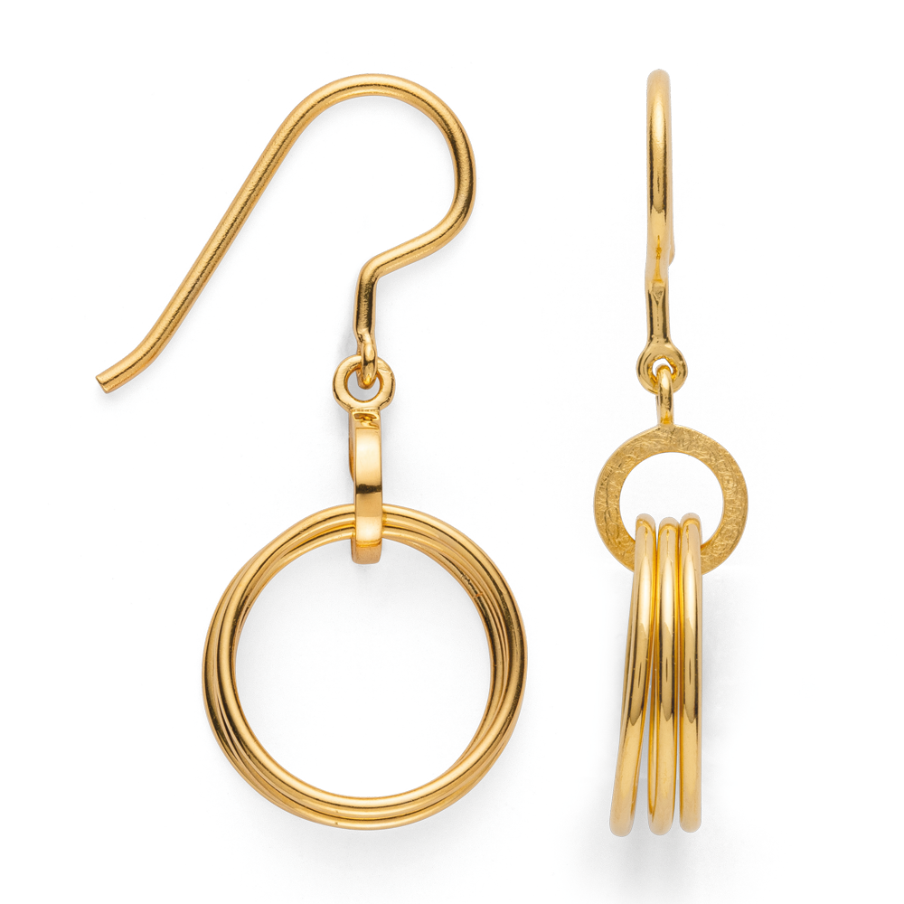 An airy, light jewelry design made of gold-plated 925 sterling silver impresses with four interconnected, circular jewelry elements. The modern and stylish design earrings designed by designer Antje Liebscher impress with their scratch-matt and polished surface structure. Perfect in combination with the matching pendant. Antje Liebscher is a qualified, freelance designer. Creative individuality and aesthetic clarity paired with a sense of uncomplicated opulence make her jewelry designs sophisticated eye-catchers that captivate everyone. “Jewelry is a lifestyle element. It underlines your personality and sets aesthetic accents.” (Antje Liebscher). All bastian inverun pieces of jewelry are delivered including appropriate jewelry packaging. Dimensions:Length of the earrings: 3 cmDiameter of the circular jewelry elements: 1.2 cm