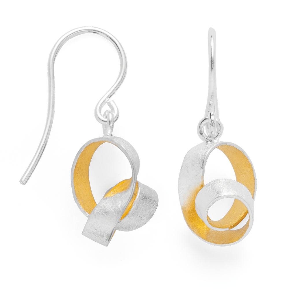 Stylishly twisted design earrings made of partially gold-plated 925/- sterling silver impress with a scratch-matt and polished surface finish. An attractive and at the same time modern design, which becomes an effective eye-catcher thanks to its unique design language. The unique earrings were created by Düsseldorf designer Nadine Resch. Perfect in combination with the matching pendant and also available in pure silver. A sensual, curved shape and a consistently characteristic design signature characterize the jewelry creations of the freelance designer Nadine Resch, who lives in Düsseldorf. Her multifaceted designs always provide fresh inspiration and rebel against the uniformity of today. All bastian inverun pieces of jewelry are delivered including matching jewelry packaging. Dimensions: Total length: 2.8 cm Length: 1.3cm Width: 1 cm