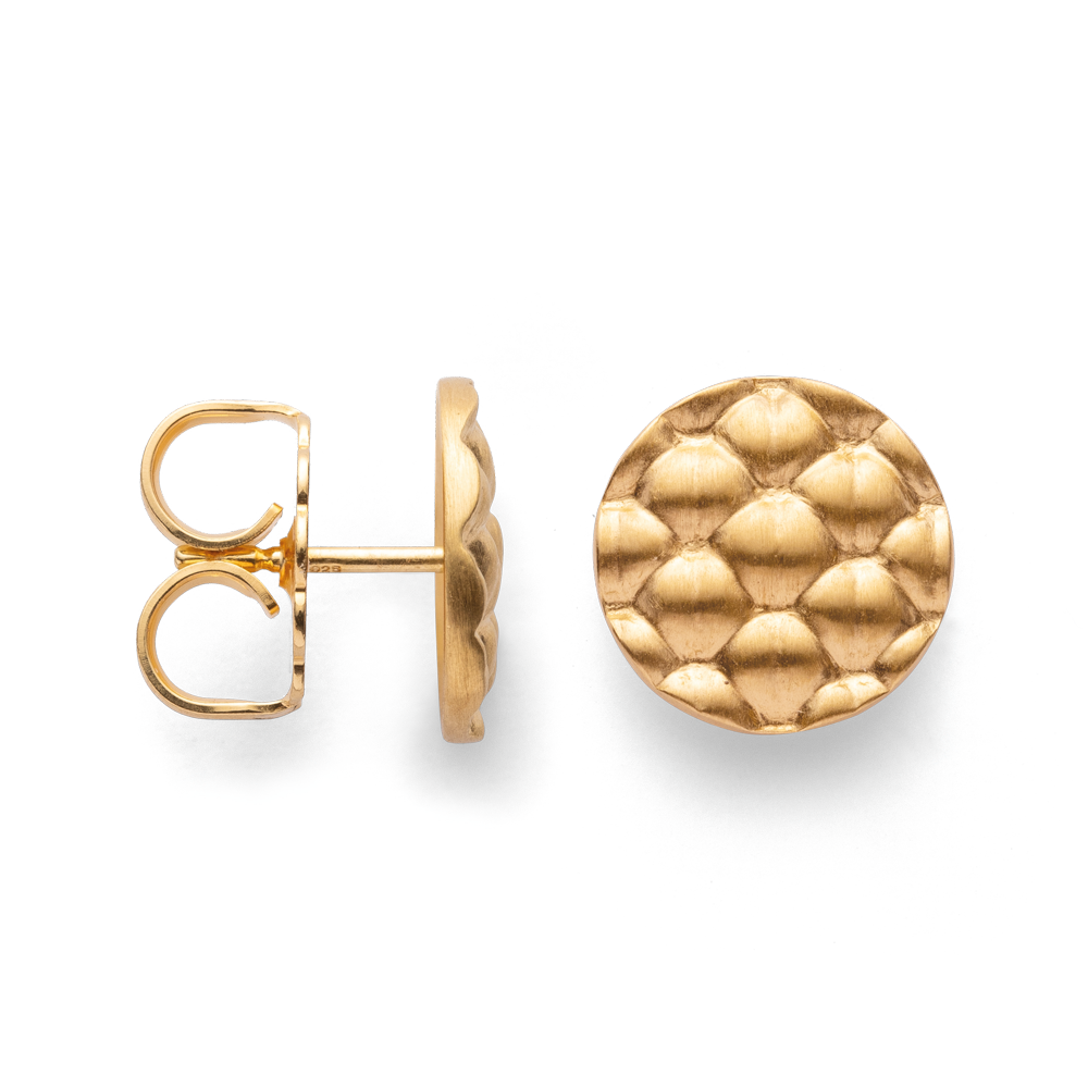 A jewelry design based on nature made of gold-plated 925/- sterling silver impresses with its characteristic surface structure. The particularly high-quality and striking appearance makes the finely handcrafted designer earrings real eye-catchers. Perfect in combination with the corresponding pendant. The master goldsmith Thomas Mayer, who lives in Rottenburg am Neckar, used his years as a journeyman to gain know-how and experience in various workshops. He loves experimenting with different materials, surfaces and natural impressions in his workshop. With this experience he is able to design sophisticated pieces of jewelry with his own signature. “For me, nature is the measure of all things.” (Thomas Mayer) All bastian inverun pieces of jewelry are delivered including appropriate jewelry packaging. Dimensions: Diameter : 1.2 cm
