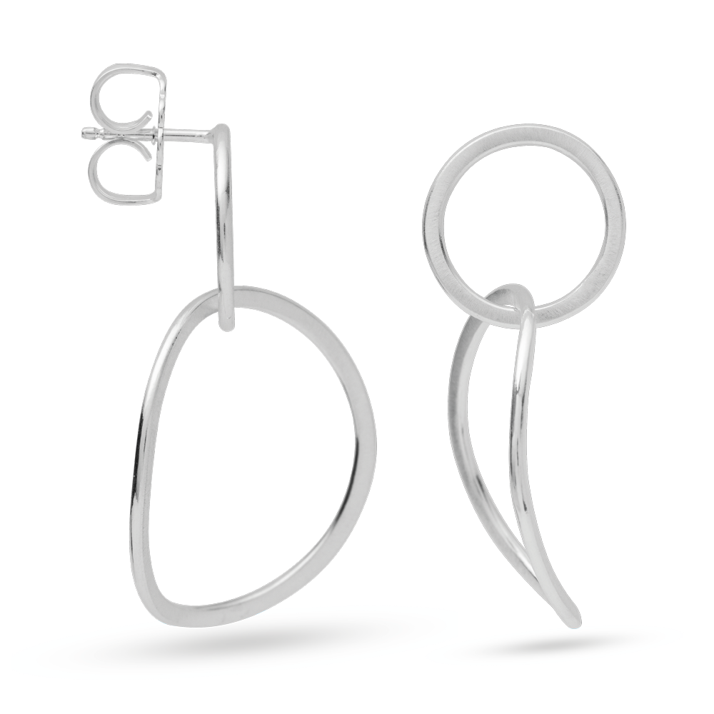 Modern and stylish at the same time – these enchanting design earrings made of matted 925/- sterling silver impress with two different shaped jewelry elements put together. The slight curvature in the lower element gives the earrings a unique look, making them an effective eye-catcher. Created by the renowned jewelry designer Antje Liebscher and can be perfectly combined with the matching necklace. Antje Liebscher is a qualified, freelance designer. Creative individuality and aesthetic clarity paired with a sense of uncomplicated opulence make her jewelry designs sophisticated eye-catchers that captivate everyone. “Jewelry is a lifestyle element. It underlines your personality and sets aesthetic accents.” (Antje Liebscher). All bastian inverun pieces of jewelry are delivered including appropriate jewelry packaging. Dimensions: Total length (without ear nut) : 3.9 cmDiameter of upper circle: 1.6 cmLength of lower circle: 2.6 cmWidth of lower circle: 2.4 cm