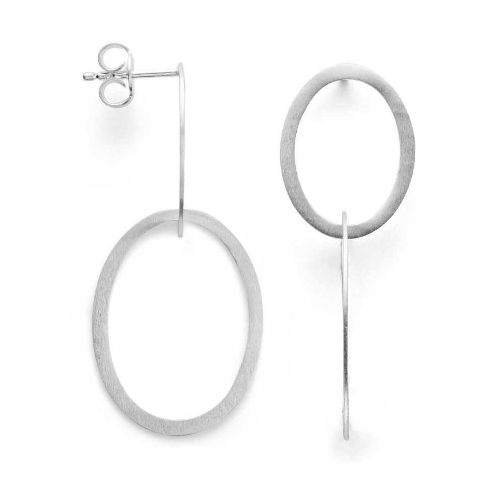Airy, light earrings designed by designer Antje Liebscher. Two delicate, circular jewelry elements made of 925/- sterling silver with a matt surface are joined together to form these modern, flexible swinging earrings, which are perfectly accentuated with the matching necklace. Suitable for every outfit and every occasion. Also available in a gold-plated version. Antje Liebscher is a qualified, freelance designer. Creative individuality and aesthetic clarity paired with a sense of uncomplicated opulence make her jewelry designs sophisticated eye-catchers that captivate everyone. “Jewelry is a lifestyle element. It underlines your personality and sets aesthetic accents.” (Antje Liebscher). All bastian inverun pieces of jewelry are delivered including matching jewelry packaging. Dimensions: Length: 3.7 cm Widest point: 1.7 cm