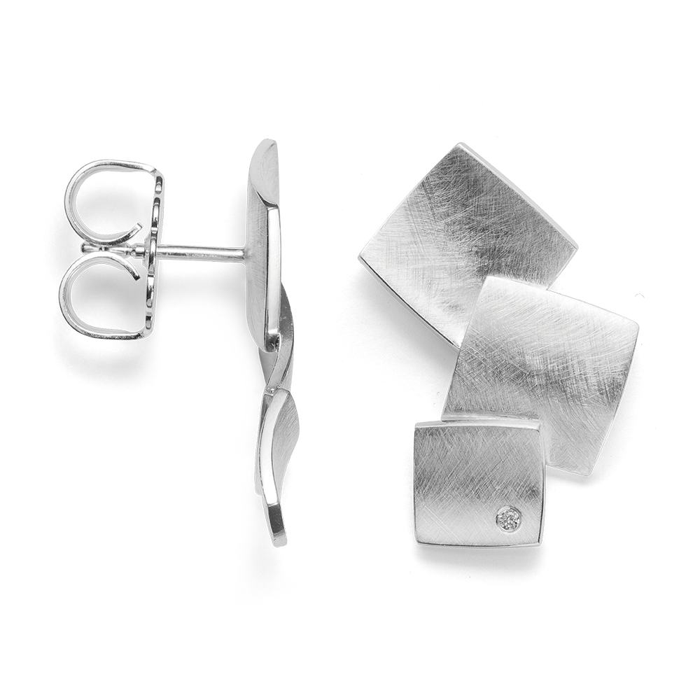 A geometrically inspired design made of 925/- sterling silver meets a sparkling, symmetrically arranged diamond with a total of 0.02ct. Three slightly curved, square and overlapping decorative elements highlight these high-quality earrings in a special way. These stud earrings come with a large ear nut for a comfortable fit on the ear. Perfect in combination with a matching ring and matching pendant. A sensual, curved shape and a consistently characteristic design signature characterize the jewelry creations of the freelance designer Nadine Resch, who lives in Düsseldorf. Their multifaceted designs always provide fresh inspiration and rebel against the uniformity of today. All bastian inverun pieces of jewelry are delivered including appropriate jewelry packaging. Dimensions: Width: max. 1.50cm Height: approx. 2.40cm
