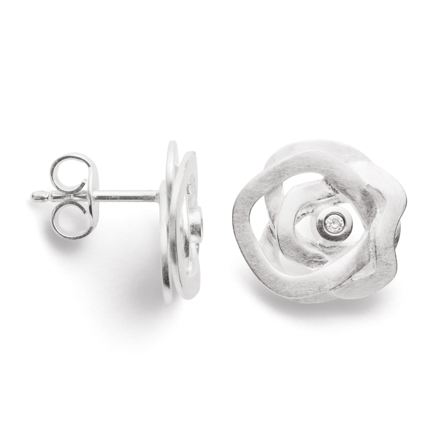 Exceptionally contrasting earrings in a “layered look”: These stud earrings made of scratch-matted 925 sterling silver impress with a highly individual, organically inspired shape and a radiant, cleverly placed diamond with a total of 0.02ct. The individual silver elements lined up and placed on top of each other emphasize the characteristic charisma of this special piece of designer jewelry. The valuable, solid workmanship that can be seen here also runs like a common thread through this special design line by bastian inverun. Available with ring and pendant. A sensual, curved shape and a consistently characteristic design signature characterize the jewelry creations of the freelance designer Nadine Resch, who lives in Düsseldorf. Their multi-faceted designs always provide fresh inspiration and rebel against the uniformity of today. All bastian inverun pieces of jewelry are delivered including appropriate jewelry packaging. Dimensions: Width x height x depth of the stud earrings: 1.3cm x 1.3cm x 3mm