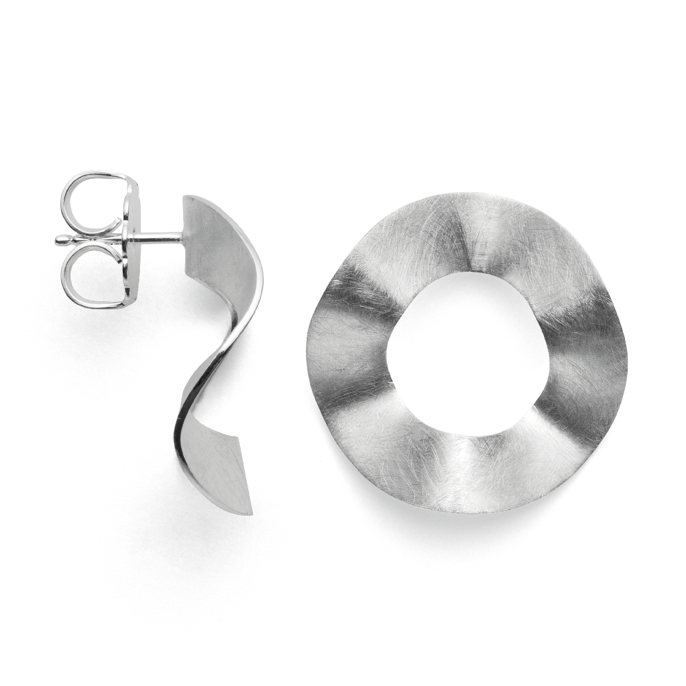 Modern and yet timelessly elegant: circular maxi stud earrings “Wavy Statement” made of scratch-matted 925/- sterling silver in a wavy design. Perfect in combination with the corresponding statement pendants from the same design series by Düsseldorf designer Nadine Resch. To ensure a comfortable fit on the ear, these ear studs are supplied with a large ear nut. A sensual, curved shape and a consistently characteristic design signature characterize the jewelry creations of the freelance designer Nadine Resch, who lives in Düsseldorf . Her multifaceted designs always provide fresh inspiration and rebel against the uniformity of today. “Each of my pieces of jewelry should have what it takes to become your favorite piece of jewelry.” (Nadine Resch) All bastian inverun pieces of jewelry are delivered including appropriate jewelry packaging. Dimensions: Length: 2.5 cmWidth: 2.5 cm