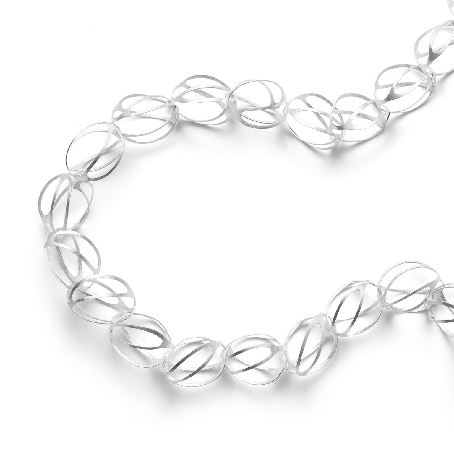 Pure design: This 100cm long necklace, made of radiant 925 sterling silver, is characterized by a sophisticated design of the numerous hand-finished, rounded individual links. A modern and innovative eye-catcher by the Polish designer Arek Wolski, which is the perfect piece of jewelry for today’s design-loving woman. The well-known designer Arek Wolski, born in Warsaw in 1972, only decided to dedicate his life to jewelry after studying physical oceanography. He acquired all of his knowledge and skills through self-study. His first great love was jewelry, but Wolski now also creates furniture, lamps and sculptures. All bastian inverun jewelry pieces are delivered including appropriate jewelry packaging. Dimensions: Length: 100cm Closure: none (pulled over the head) cannot be worn doubled around the neck Dimensions of a single chain link: width approx. 2.1cm x length approx. 2.9cm Number of chain links: 37 pieces