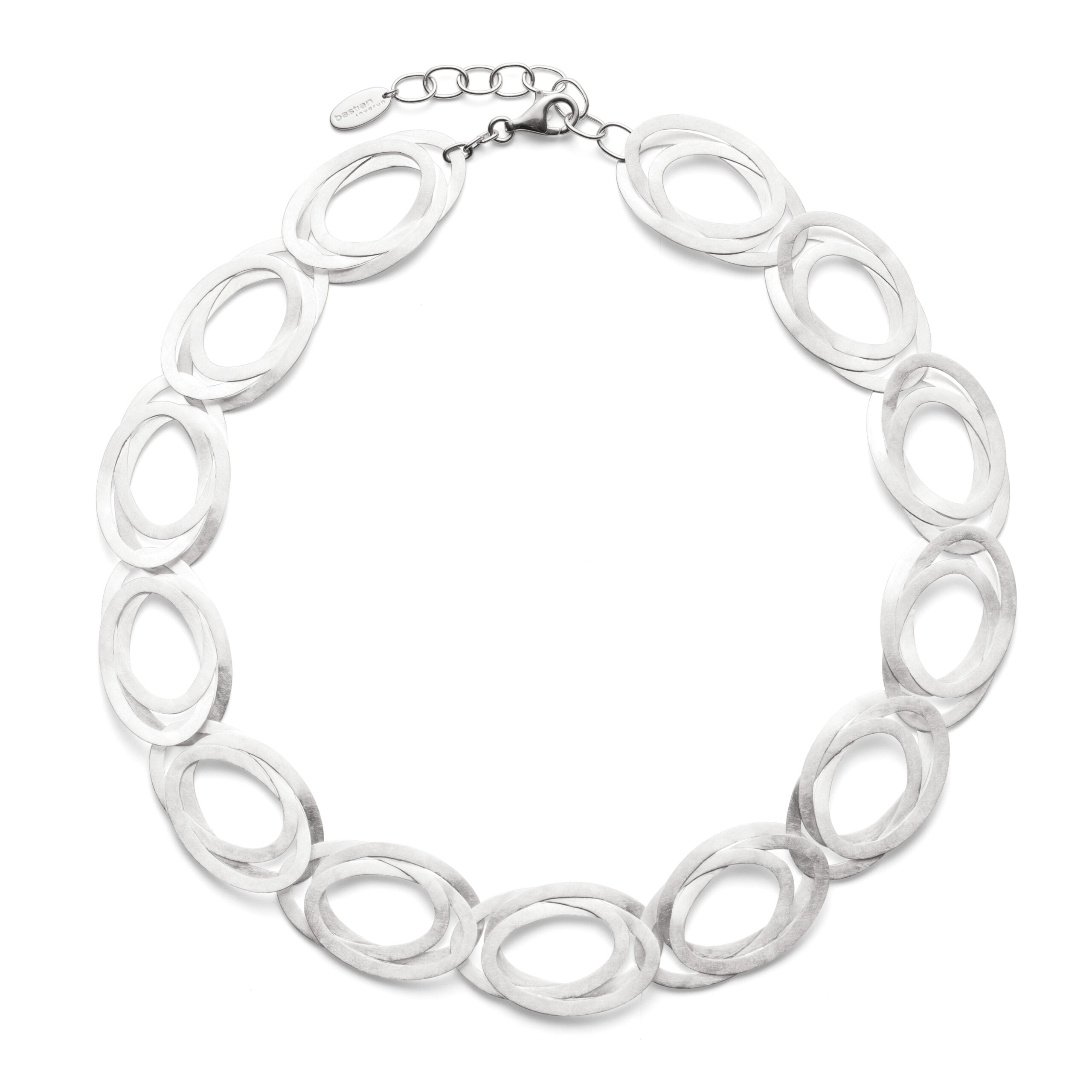 This handcrafted design necklace, designed by designer Nadine Resch and equipped with a lobster clasp, fascinates with its 13 oval necklace links in a trendy layered look. The 50cm long necklace made of radiant 925 sterling silver is also adjustable in length (+5cm) and is particularly comfortable to wear. A wonderful piece of jewelry for almost every occasion. A sensual, curved shape and a consistently characteristic design signature characterize the jewelry creations of the freelance designer Nadine Resch, who lives in Düsseldorf. Her multifaceted designs always provide fresh inspiration and rebel against the uniformity of today. All bastian inverun jewelry pieces are delivered including appropriate jewelry packaging. Dimensions: Width of the individual links: 2.7cm Length of the length-adjustable necklace: 50 cm + 5cm Number of individual links: 13 pieces Closure type: lobster clasp