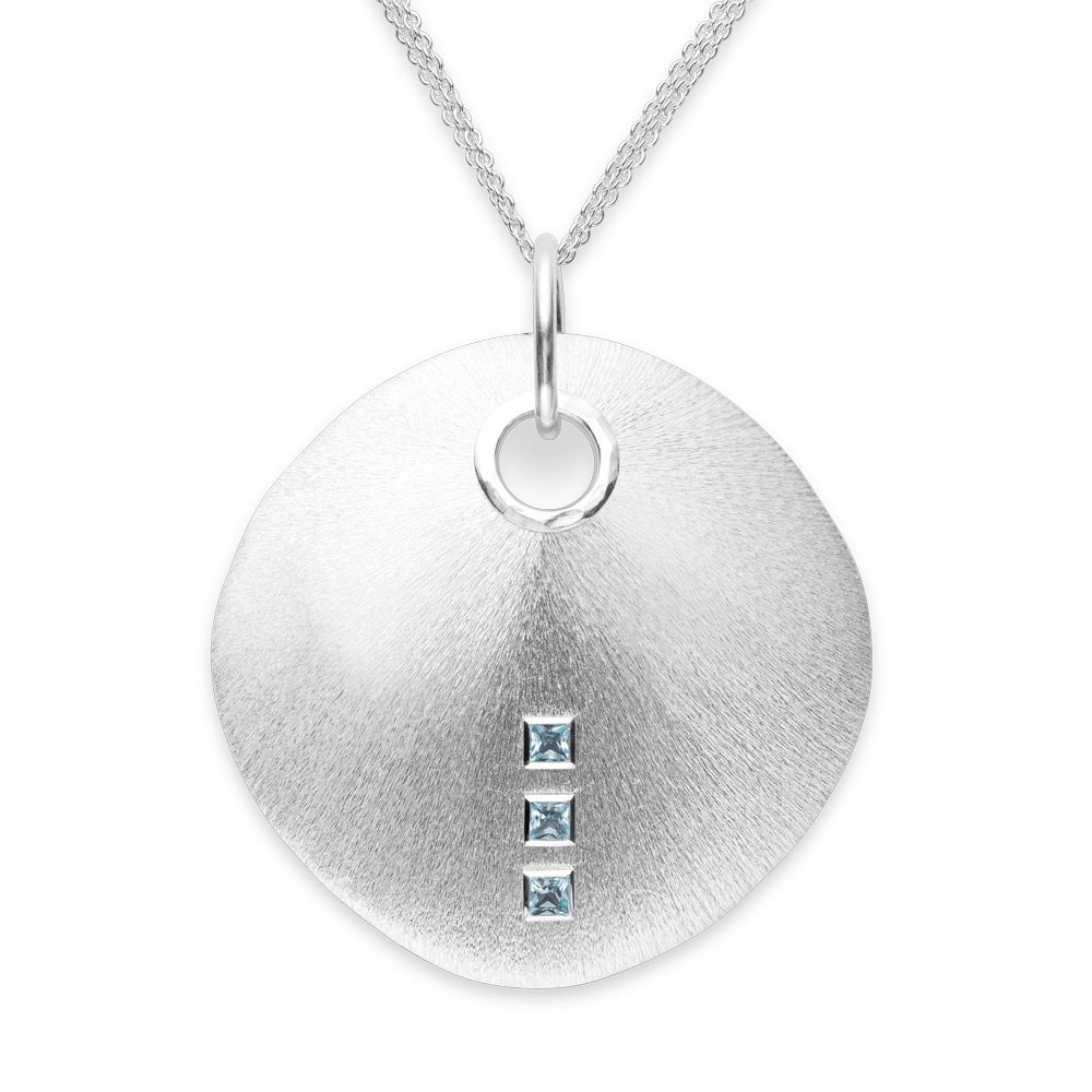 Brushed 925/- sterling silver is formed into a jewelry disc in special manufacturing quality with three princess-cut blue topazes (0.59 ct in total). The edge of the eyelet hole, which has a hammered look, ensures the particularly high-quality and striking appearance of the piece of jewelry from the pen of the renowned Osnabrück designer Dietmar Sebastian. We recommend this designer jewelry pendant with a unique character on a longer chain or a longer ribbon (from 50cm). Also available in a smaller version made of gold-plated silver with smoky quartz. The most memorable thing about the jewelry from Osnabrück-based designer Dietmar Sebastian is the surface design. When he started making his jewelry with rough surface structures in the 90s, it was a small sensation. Among the designers, Dietmar Sebastian is one of the minimalists, because omission is crucial for him. For him there are no decorative applications in jewelry, only the pure form counts. All bastian inverun pieces of jewelry are delivered including appropriate jewelry packaging. All bastian inverun pendants are delivered without a corresponding accessory chain unless otherwise noted. Dimensions: • Length: 5.9 cm • Width: 5.3 cm
