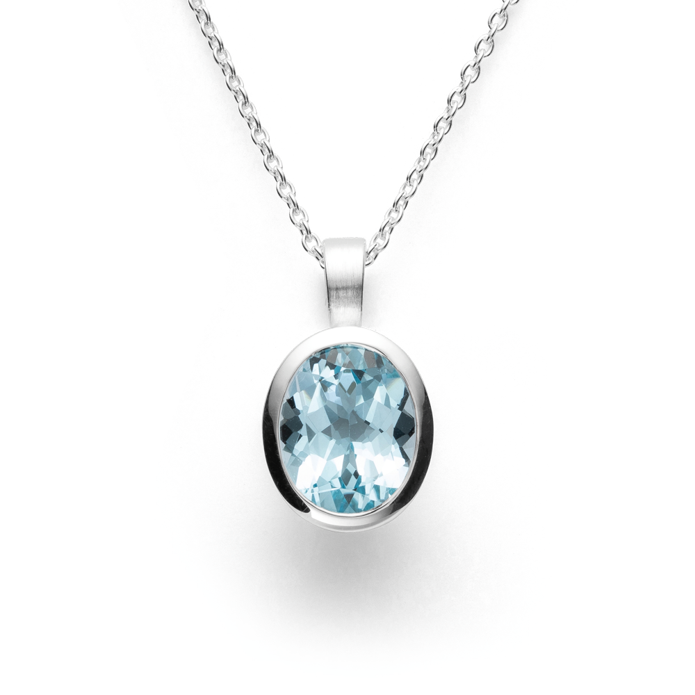 Modern and stylish at the same time – This colorful pendant made of matt and polished 925/- sterling silver enchants with a sparkling, slightly oval normal cut blue topaz weighing 3.99ct. Perfectly available in combination with the corresponding ring. The master goldsmith Thomas Mayer, who lives in Rottenburg am Neckar, used his years as a journeyman to gain know-how and experience in various workshops. He loves experimenting with different materials, surfaces and natural impressions in his workshop. With this experience he is able to design sophisticated pieces of jewelry with his own signature. “For me, nature is the measure of all things.” (Thomas Mayer) All bastian inverun pieces of jewelry are delivered including appropriate jewelry packaging. This pendant is Delivered including the attached round anchor chain. Dimensions: Length of chain: 45 cm Extension chain: 5 cm Length of the pendant including eyelet: 1.9 cm Width of the pendant : 1.1 cm Length of the blue topaz: 1.1 cm Width of the blue topaz: 0.9 cm