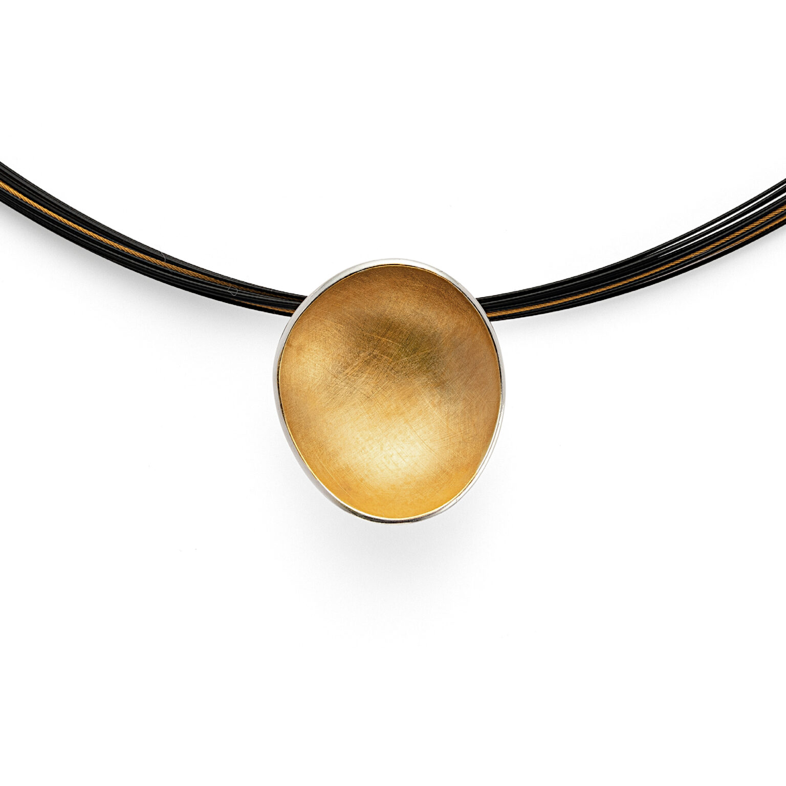 Golden Bowl Collection’ – this geometrically shaped pendant made of gold-plated 925/- sterling silver impresses with its bicolor design in combination with a scratch-matt surface design. The not exactly circular design and the inward curvature emphasize the particularly handcrafted character of the pendant. The hidden suspension on the back also ensures a particularly sporty and elegant expression of the piece of jewelry, which was designed by the Osnabrück designer Dietmar Sebastian. Available with matching earrings and a matching ring. The most memorable thing about the jewelry from Osnabrück-based designer Dietmar Sebastian is the surface design. When he started making his jewelry with rough surface structures in the 90s, it was a small sensation. Among the designers, Dietmar Sebastian is one of the minimalists, because omission is crucial for him. For him there are no decorative applications in jewelry, only the pure form counts. All pendants are delivered without a corresponding accessory chain unless otherwise noted. All bastian inverun pieces of jewelry are delivered including appropriate jewelry packaging. Dimensions: Length: 2 cm Width: 1.6 cm