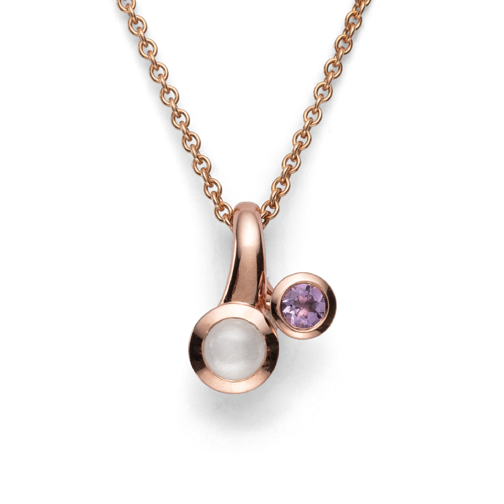 Rose gold-plated polished 925/- sterling silver meets a sparkling amethyst (0.15ct) and a white moonstone (0.43ct). The special coloring and the filigree design make the pendant, made with the finest craftsmanship, a special eye-catcher. This piece of designer jewelry was created by the German designer Nadine Resch with great attention to detail and a feeling for the small, special features. Available with matching ear studs and matching ring. A sensual, curved shape and a consistently characteristic design signature characterize the jewelry creations of the freelance designer Nadine Resch, who lives in Düsseldorf. Her multifaceted designs always provide fresh inspiration and rebel against the uniformity of today. All pendants are delivered without a corresponding accessory chain unless otherwise noted. All bastian inverun pieces of jewelry are delivered including appropriate jewelry packaging. Dimensions: Length: 1.5 cm Width: 1.1 cm