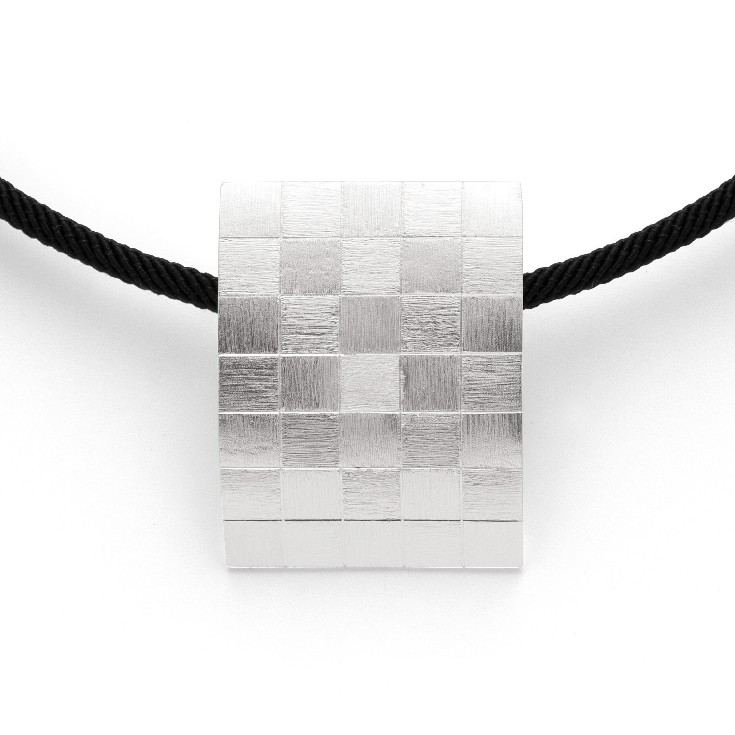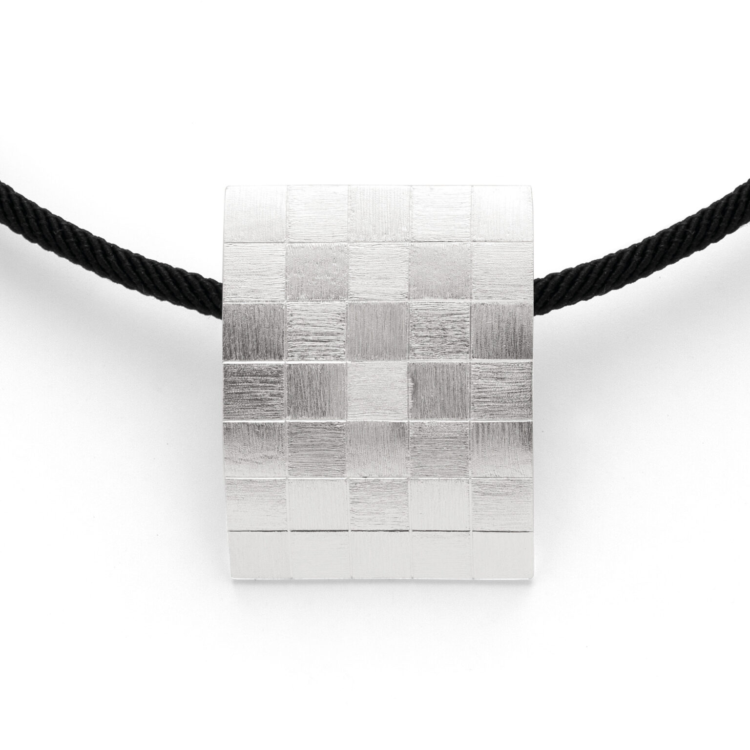 The new “Chessboard Collection” – a geometrically inspired highlight line by bastian inverun: This rectangular, slightly curved pendant designed by the Osnabrück designer Dietmar Sebastian is a homage to geometry and surface design in the jewelry sector. Dozens of individual squares are lovingly handcrafted into the radiant 925/- sterling silver. The matt line, which is sometimes horizontally and sometimes vertically aligned, also ensures a unique shiny effect for the characterful necklace with hidden suspension. The most memorable thing about the jewelry from Osnabrück-based designer Dietmar Sebastian is the surface design. When he started making his jewelry with rough surface structures in the 90s, it was a small sensation. Among the designers, Dietmar Sebastian is one of the minimalists, because omission is crucial for him. For him there are no decorative applications in jewelry, only the pure form counts. All pendants are delivered without a corresponding accessory chain unless otherwise noted. All bastian inverun pieces of jewelry are delivered including matching jewelry packaging. Dimensions: Width: 2.6 cm Height: 3.2 cm