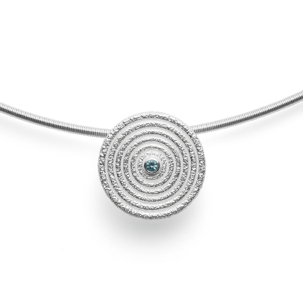 “The Round ‘n’ Round Collection” – a brand new, geometrically inspired design line from the pen of designer Thomas Mayer. Matted and brushed 925/- sterling silver in an attractive ring look is crowned by a radiant blue topaz (0.03ct). The hidden suspension ensures the particularly elegant look of this attractive necklace. We recommend an accessory hoop for this trailer. Available with matching ear studs and in other designs. The master goldsmith Thomas Mayer, who lives in Rottenburg am Neckar, used his years as a journeyman to gain know-how and experience in various workshops. He loves experimenting with different materials, surfaces and natural impressions in his workshop. With this experience he is able to design sophisticated pieces of jewelry with his own signature. “For me, nature is the measure of all things.” (Thomas Mayer) All bastian inverun pieces of jewelry are delivered including appropriate jewelry packaging. All bastian inverun Trailers are delivered without a corresponding accessory chain unless otherwise noted. Dimensions: Diameter: 1.5 cmDiameter of the blue topaz: 0.15 cm