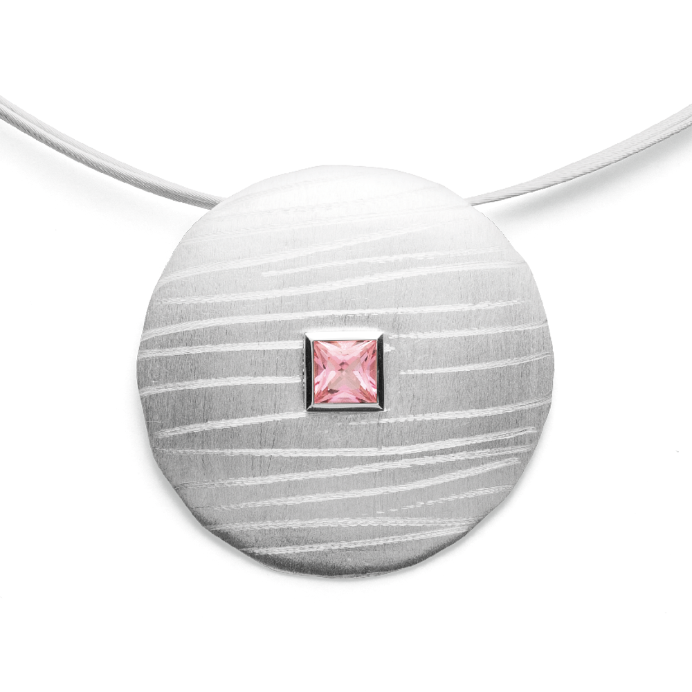 This distinctive disc pendant made of matt and brushed 925 sterling silver stands out due to two sophisticated features. The individual surface design of the pendant (design by Dietmar Sebastian) meets a centrally positioned, specially cut pink topaz with 0.70 ct, which is particularly highlighted by the polished and square setting. A magical piece of jewelry that can be combined both sporty and elegant. The most memorable thing about the jewelry from Osnabrück-based designer Dietmar Sebastian is the surface design. When he started making his jewelry with rough surface structures in the 90s, it was a small sensation. Among the designers, Dietmar Sebastian is one of the minimalists, because omission is crucial for him. For him there are no decorative applications in jewelry, only the pure form counts. All pendants are delivered without a corresponding accessory chain unless otherwise noted. All bastian inverun pieces of jewelry are delivered including matching jewelry packaging. Dimensions: Diameter: 3.2 cm Height and width gemstone: 0.5 cm