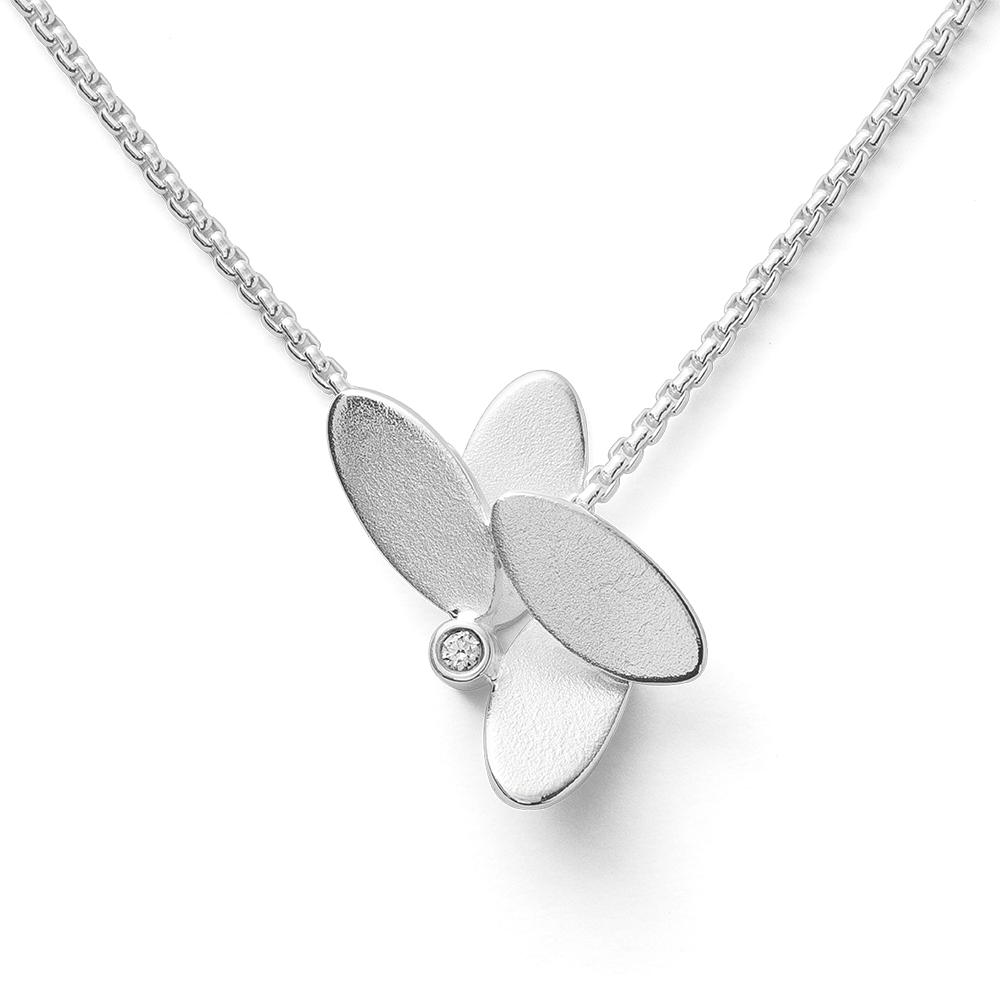 Floral-inspired design meets sparkling diamonds: This pendant made of matt 925/- sterling silver impresses with its Nordic-inspired, organically shaped leaf look in combination with a diamond highlight totaling 0.02ct. Kaja Gjedebo is the Norwegian designer of this handmade piece of jewelry. Designer Kaja Gjedebo fell in love with the art of jewelry while training as a furniture designer at Edinburgh College of Art. Unlike furniture design, the creation of jewelry is not about issues such as comfort, but purely about how the jewelry looks on the body. When designing jewelry, she focuses on finding basic shapes that can be reproduced but also dismantled and reassembled to create small sculptures for the body. Her passion is to create works of art that enhance the beauty and personality of the wearer. “I am inspired by my morning walks in the forest on my doorstep, the architecture and the urban details. The endless possibilities of folding a piece of paper never cease to fascinate me.” All pendants are delivered without the corresponding accessory chain unless otherwise noted. All bastian inverun pieces of jewelry are delivered including matching jewelry packaging. Dimensions: Length (measured at the longest point): 1.8 cm Width (measured at the longest point): 1.0 cm