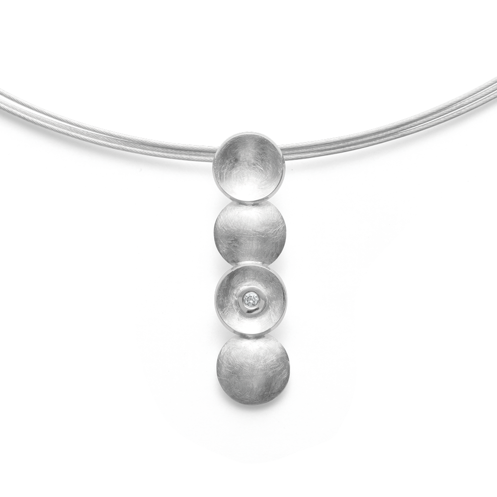 Four bowl-shaped decorative elements lined up together, complemented by a sparkling brilliant-cut diamond (0.02ct), create this timeless yet modern, elongated pendant (design by Nadine Resch). Perfect in addition to the matching ear studs and the matching ring. A sensual, curved shape and a consistently characteristic design signature characterize the jewelry creations of the freelance designer Nadine Resch, who lives in Düsseldorf. Her multifaceted designs always provide fresh inspiration and rebel against the uniformity of today. All pendants are delivered without a corresponding accessory chain, unless otherwise noted. All bastian inverun jewelry pieces are delivered including matching jewelry packaging. Dimensions: Length: 2.9 cm Diameter of the circles: 0.8 cm Diameter of the brilliant: 0.2 cm