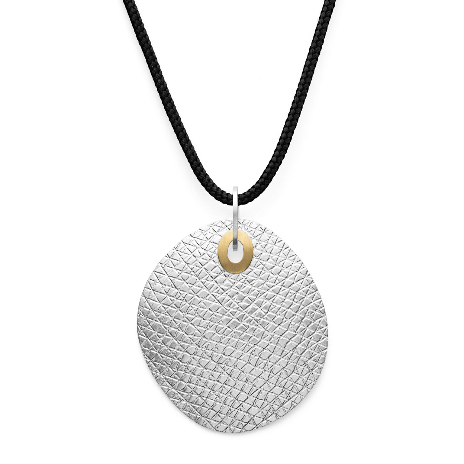 This magical pendant made of 925 sterling silver impresses with its characteristic surface structure and an 18 carat gold soldered suspension, which makes the piece of jewelry a real and valuable eye-catcher. Created with great attention to detail by designer Dietmar Sebastian. Available with a matching ring, matching ear studs and the corresponding brooch. The most memorable thing about the jewelry from Osnabrück-based designer Dietmar Sebastian is the surface design. When he started making his jewelry with rough surface structures in the 90s, it was a small sensation. Among the designers, Dietmar Sebastian is one of the minimalists, because omission is crucial for him. For him there are no decorative applications in jewelry, only the pure form counts. All pendants are delivered without a corresponding accessory chain unless otherwise noted. All pendants are delivered without a corresponding accessory chain unless otherwise noted. All bastian inverun pieces of jewelry are delivered including appropriate jewelry packaging. Dimensions: Length incl. Eyelet: 4.6 cm Widest point: 3.5 cm