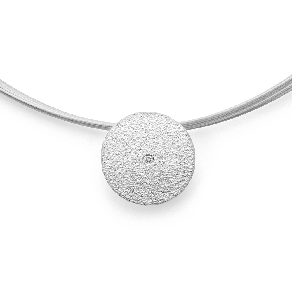 This pendant made of 925/- sterling silver impresses with a hand-finished matt, brushed surface structure and a sparkling diamond with 0.02 ct. A special piece of jewelry that can be combined in many ways and is very well received thanks to the high-quality workmanship and consistently handcrafted character. Perfect in combination with the matching ear studs and matching ring. The master goldsmith Thomas Mayer, who lives in Rottenburg am Neckar, used his years as a journeyman to gain know-how and experience in various workshops. He loves experimenting with different materials, surfaces and natural impressions in his workshop. With this experience he is able to design sophisticated pieces of jewelry with his own signature. “For me, nature is the measure of all things.” (Thomas Mayer) All pendants are delivered without a corresponding accessory chain, unless otherwise noted. All bastian inverun jewelry pieces are delivered including matching jewelry packaging. Dimensions: Diameter: 1.9 cm