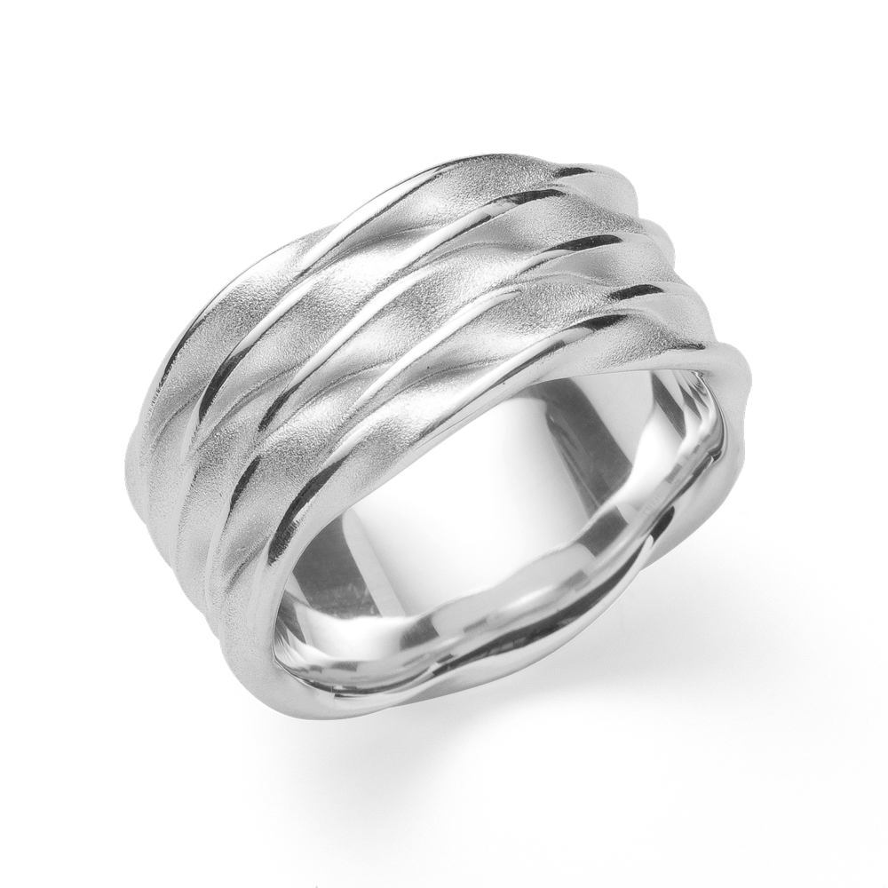 Silver Wave Collection’ – a magical ring made of 925 sterling silver, which is characterized by a unique and characteristic surface design. The wide ring band and the characteristic surface show the high-quality workmanship of this piece of designer jewelry, making it a real eye-catcher. Perfect in combination with the matching pendant and matching ear studs. The master goldsmith Thomas Mayer, who lives in Rottenburg am Neckar, used his years as a journeyman to gain know-how and experience in various workshops. He loves experimenting with different materials, surfaces and natural impressions in his workshop. With this experience he is able to design sophisticated pieces of jewelry with his own signature. “For me, nature is the measure of all things.” (Thomas Mayer) Aall bastian inverun jewelry pieces are delivered including appropriate jewelry packaging.Dimensions: Width of the ring band: 1 cm