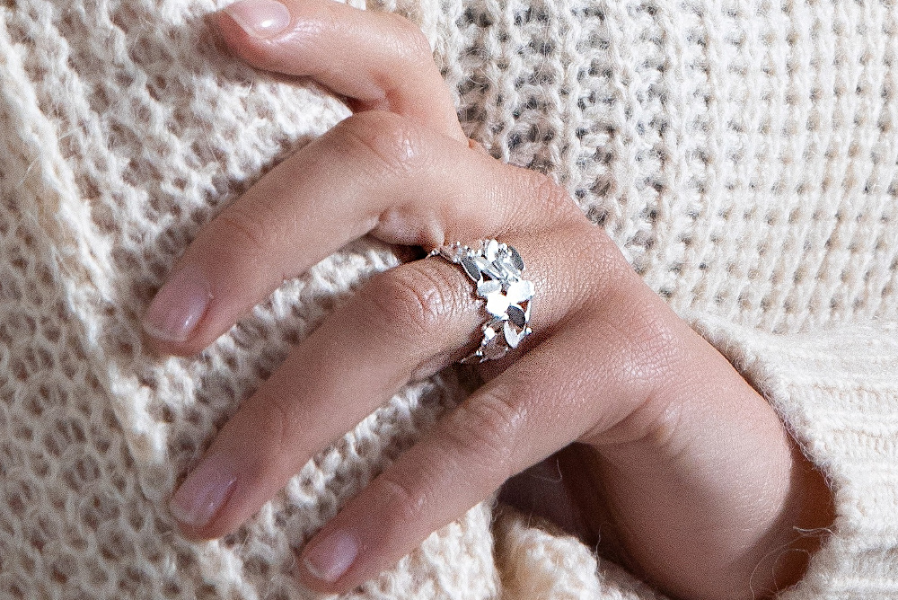 “The Secret Garden Collection” – a new, distinctive design line by the Norwegian designer Kaja Gjedebo. Numerous individual decorative elements that look like leaves form this feminine piece of designer jewelry with three sparkling brilliant-cut diamonds (0.03ct in total, W-SI). Perfect as a set with the matching ear studs and pendant. Kaja Gjedebo is the name of bastian inverun’s Norwegian designer. With her design philosophy she always expresses her connection to nature. The jewelry designer relies on basic shapes that can be duplicated, but also dismantled and reassembled to create small sculptures for the body. This is how she lives out her passion for creating works of art that emphasize the beauty and personality of the wearer. “I am inspired by my morning walks in the forest on my doorstep, the architecture and the urban details. The endless possibilities of folding a piece of paper never cease to fascinate me.” (Kaja Gjedebo) All bastian inverun pieces of jewelry are delivered with matching jewelry packaging. Dimensions: • Width: 0.90 cm • Width of the ring band: 0.50-0.70 cm