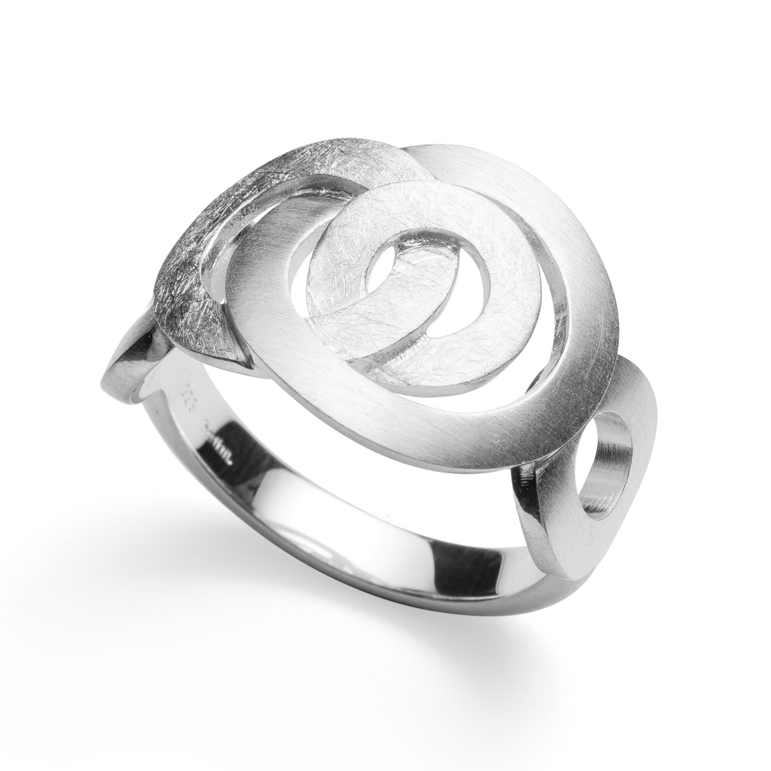 Intertwined circles meet an attractive interplay of different surface textures. This expressive ring made of brushed and scratch-matted 925/- sterling silver impresses with its striking ring head and a geometrically inspired design. The designer Nadine Resch from Düsseldorf created this sporty, elegant piece of designer jewelry, which can be optimally combined with the matching earrings. A sensual, curved shape and a consistently characteristic design signature characterize the jewelry creations of the freelance designer Nadine Resch, who lives in Düsseldorf. Her multifaceted designs always provide fresh inspiration and rebel against the uniformity of today. “Each of my pieces of jewelry should have what it takes to become your favorite piece of jewelry.” (Nadine Resch) All bastian inverun pieces of jewelry are delivered including appropriate jewelry packaging. Dimensions: Width of the ring band (bottom): 0.3 cm Width of the ring head: 1.6 cm
