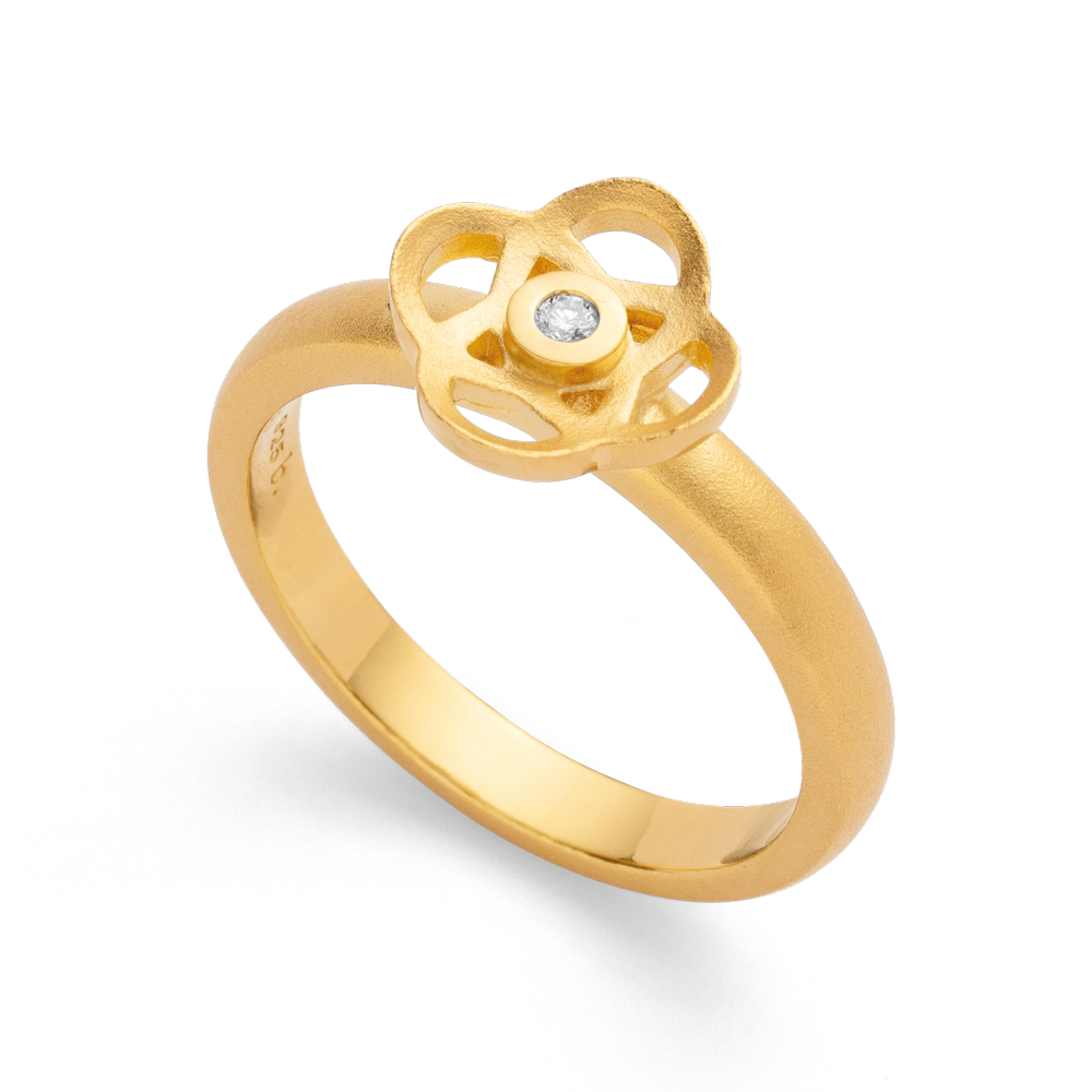 Sensual, feminine jewelry design made of gold-plated 925 sterling silver. This sand-matted ring impresses with its distinctive design and a sparkling brilliant-cut diamond (0.02 ct), which is framed by a polished setting. This designer ring was created with great attention to detail by the Düsseldorf designer Nadine Resch. Perfect in combination with the matching ear studs and the matching pendant. A sensual, curved shape and a consistently characteristic design signature characterize the jewelry creations of the freelance designer Nadine Resch, who lives in Düsseldorf. Her multifaceted designs always provide fresh inspiration and rebel against the uniformity of today. All bastian inverun pieces of jewelry are delivered including appropriate jewelry packaging. Dimensions: Width of the ring band: 0.3 cm Diameter of the ring head: 1.0 cm Diameter of the brilliant: 0.15 cm