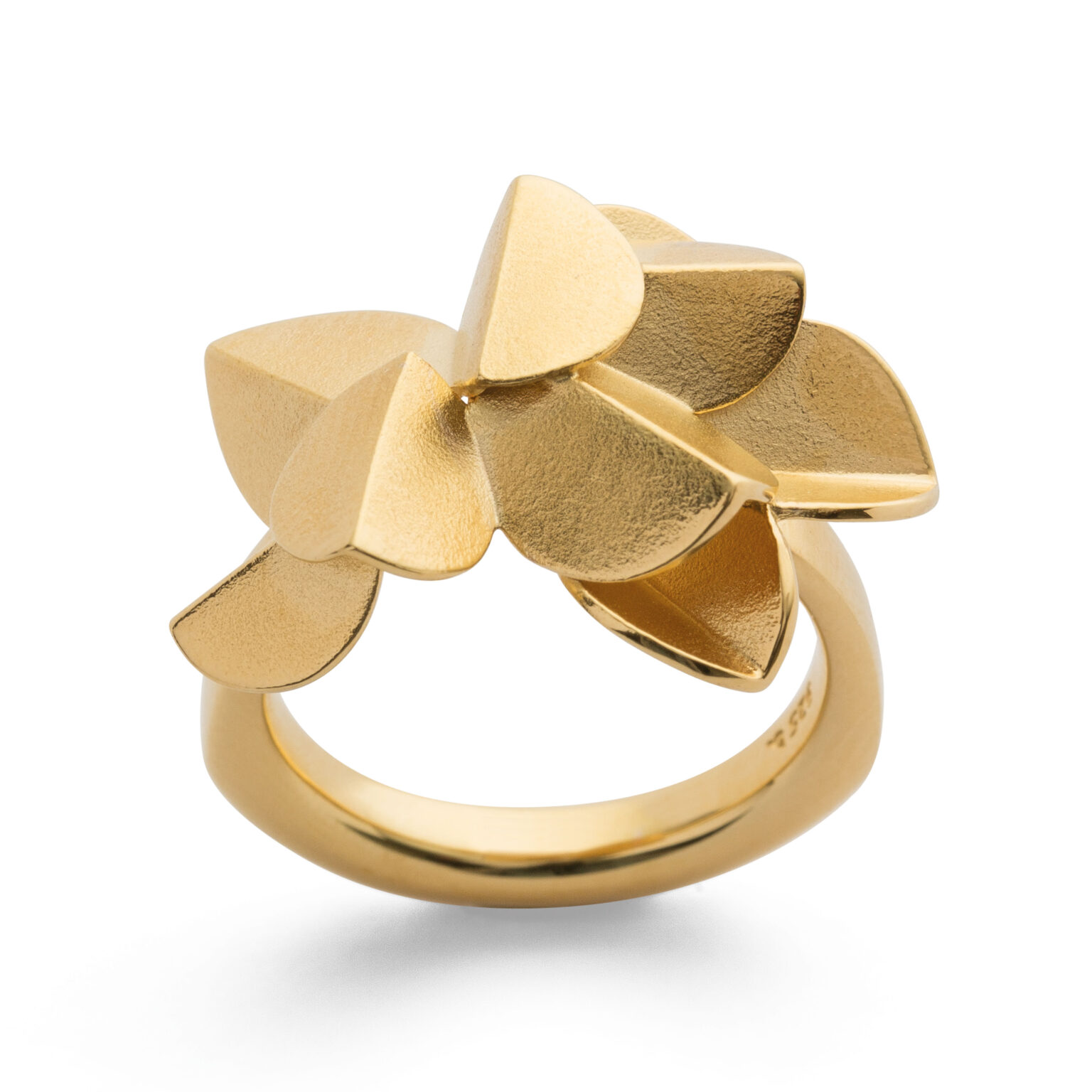 Wonderful jewelry from “The Fairytale Leaf Collection” by bastian inverun: This 18 carat yellow gold-plated ring made of 925/- sterling silver in a sand matt look with a polished ring band impresses with the Nordic-style, organically shaped leaf shape of the ring head . Kaja Gjedebo is the Norwegian designer of this handmade piece of jewelry. The ring is also available in pure silver. Designer Kaja Gjedebo fell in love with the art of jewelry while training as a furniture designer at Edinburgh College of Art. Unlike furniture design, the creation of jewelry is not about issues such as comfort, but purely about how the jewelry looks on the body. When designing jewelry, she focuses on finding basic shapes that can be reproduced but also dismantled and reassembled to create small sculptures for the body. Her passion is to create works of art that emphasize the beauty and personality of the wearer. “I am inspired by my morning walks in the forest on my doorstep, the architecture and the urban details. The endless possibilities of folding a piece of paper never cease to fascinate me.” (Kaja Gjedebo) All bastian inverun pieces of jewelry are delivered including jewelry packaging. Dimensions: Width ring band: approx. 0.3 cm Width of the ring head: 2.5 cm Height of the ring head: 2 cm