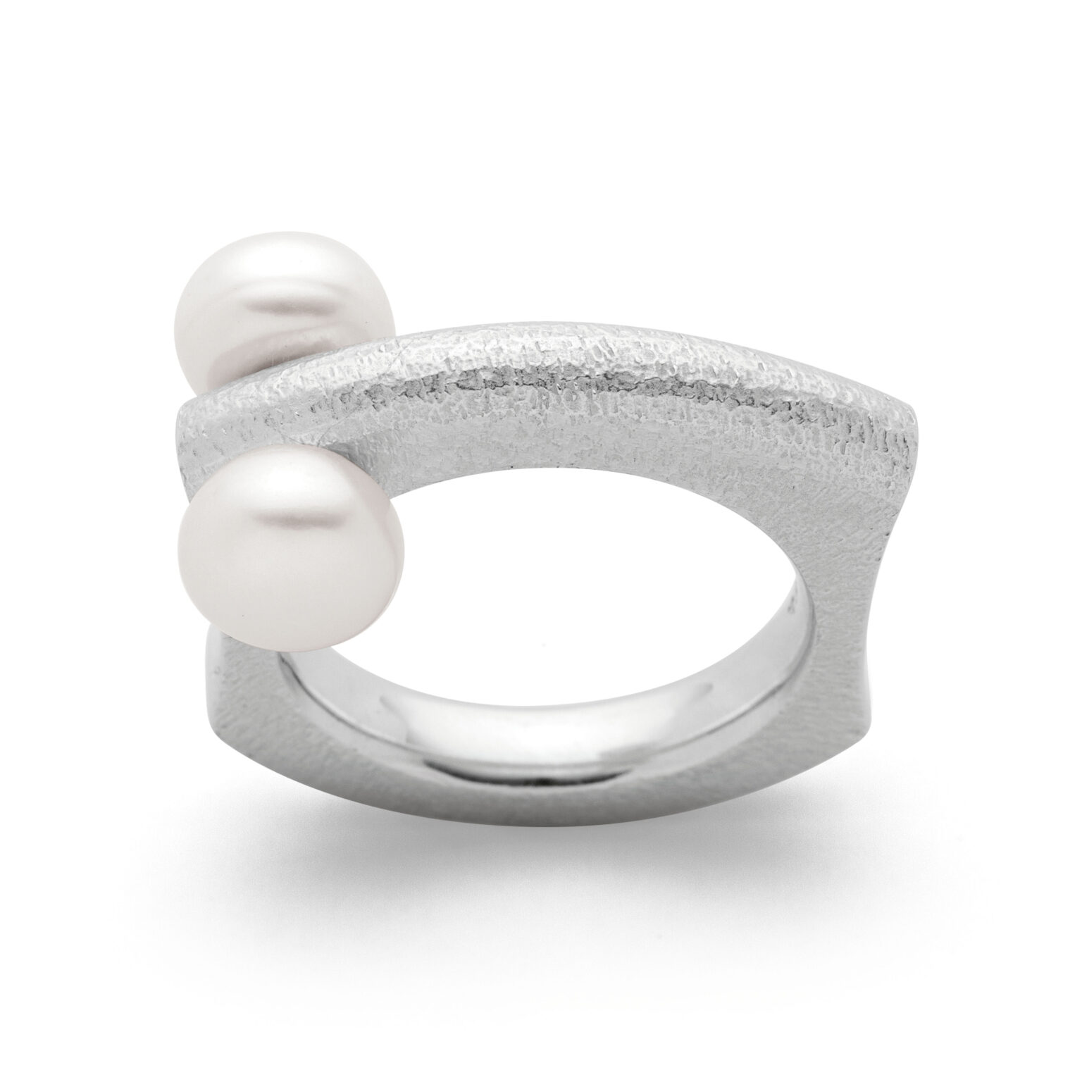 This handcrafted ring made of rhodium-plated (tarnish-proof) 925 sterling silver in a partial matt finish impresses with the characteristic shape of the ring band and an iridescent pearl duo arranged on the side, which particularly emphasizes the special style of the piece of designer jewelry. The polished sides of the innovatively shaped ring band ensure that the finger jewelry designed by designer Annette Kowalsky is particularly comfortable to wear. A great eye-catcher for today’s design-loving woman. The designs by trained watchmaker and goldsmith Annette Kowalsky are a homage to female elegance. Individuality and expressiveness are the central attributes that give the independent jewelry designer’s authentic pieces of jewelry their unmistakable style and make them an object of desire. All bastian inverun pieces of jewelry are delivered including appropriate jewelry packaging. Dimensions: Width of the ring band: 0.4cm Diameter of the beads: 0.6cm