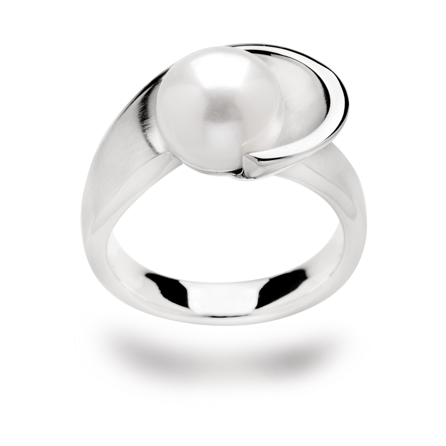 Pearls represent purity, elegance and the inimitable aesthetics of nature. This valuable, solidly crafted ring made of rhodium-plated (tarnish-protected) 925 sterling silver with a brushed and partially polished surface perfectly expresses the exceptionally draped and caressed white cultured pearl as a symbol of timeless beauty. Available with matching stud earrings and pendant. Design: Dr. Sabine Brandenburg-Frank. The sensuality of pearls captivates everyone. For this reason, bastian inverun has been relying on this unique natural treasure for over 40 years, which arises from a defense reaction against parasites inside mussels. The shine of sterling silver highlights the elegant shimmer of the pearls in a first-class way. Due to the shimmer of the pearls, also known as “lustre”, created by the refraction of light on the surface, they have always stood for aesthetics and sensual, feminine elegance par excellence. Pearls come in almost every color variety and the variety of shapes is immense. They are made of mother of pearl, a biomineral that consists primarily of the composite material calcium carbonate. All bastian inverun pieces of jewelry are delivered including appropriate jewelry packaging. Dimensions: Width of the ring band: 4 mm Ring head: width 12 mm Pearl size: 9 mm